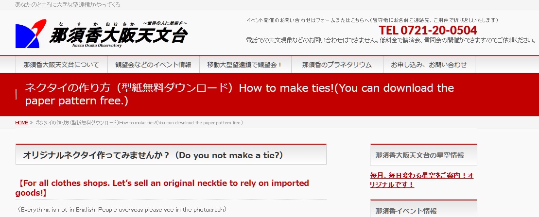 「初心者と熟練者が交錯する!はじめてのネクタイづくり」の続きだ。 前回は女性の着用するネクタイへの渇望を語り、自分で作ってみようと決心したことを語り、たかだか数百円~1,200円ほどを吝嗇り、無料型紙でどこまでできるか試しはじめ、手芸屋・ユザワヤのレシピに翻弄されたところで幕引きとした。 「無料 型紙 ネクタイ」 ユザワヤに翻弄されたのち、わたしがすぐさまこの語をGoogle検索窓に入力したのは言うまでもない。 コスプレ用、あるいは子どもの入卒園用などと書いてある記事をかき分け、ようやくとあるブログに辿り着いた。 ……天文台!?▲ 那須香大阪天文台「ネクタイの作り方(型紙無料ダウンロード)How to make ties!(You can download the paper pattern free.)」 http://nazca-osaka.org/wordpress/?page_id=281(最終閲覧日:2025年12月4日) 記事のタイトルの下には、