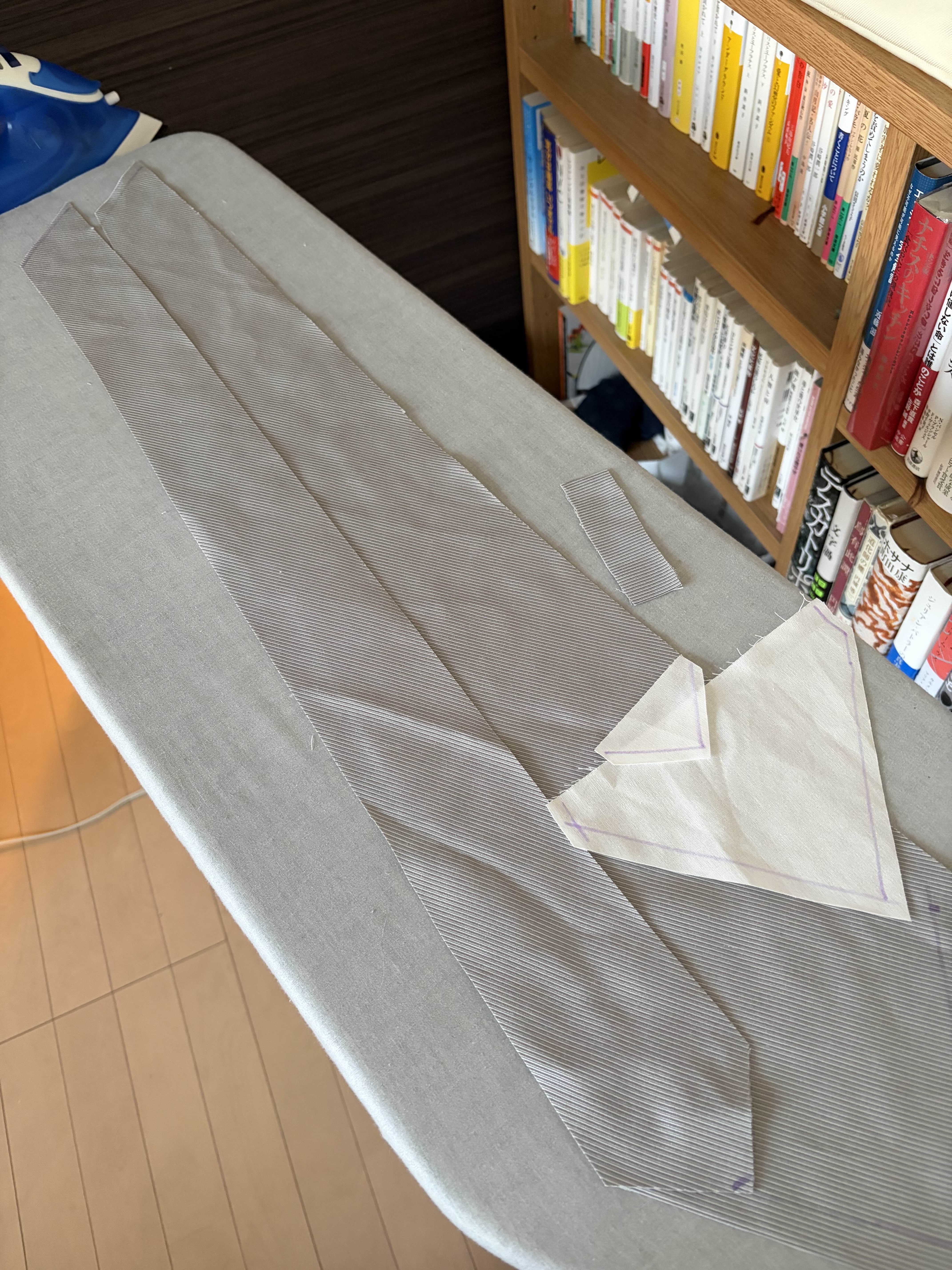 そう、ここでわたしは、裁縫初心者の方が書くレシピの難しさに直面した。この記事を書いた方はどうやら、ふだん裁縫をあまりしない人を想像して書いているようだ。よって、レシピは裁縫の専門用語をなるべく省いて書かれている。「中表で縫う」と書いていただければ分かるところを、別の語彙で説明される。それが、裁縫を少しかじってしまったわたしにとっては、かえって分かりづらいのだ! だから、ここからはwebサイトを斜め読みしつつ、ほとんどカンで作っている。これまでに触ったネクタイ、着用したネクタイの形状を考えながら形を作っていった。それでもパーツが少ないので、形にはなっていく。数学の簡単な問題を解いているようなものだ。