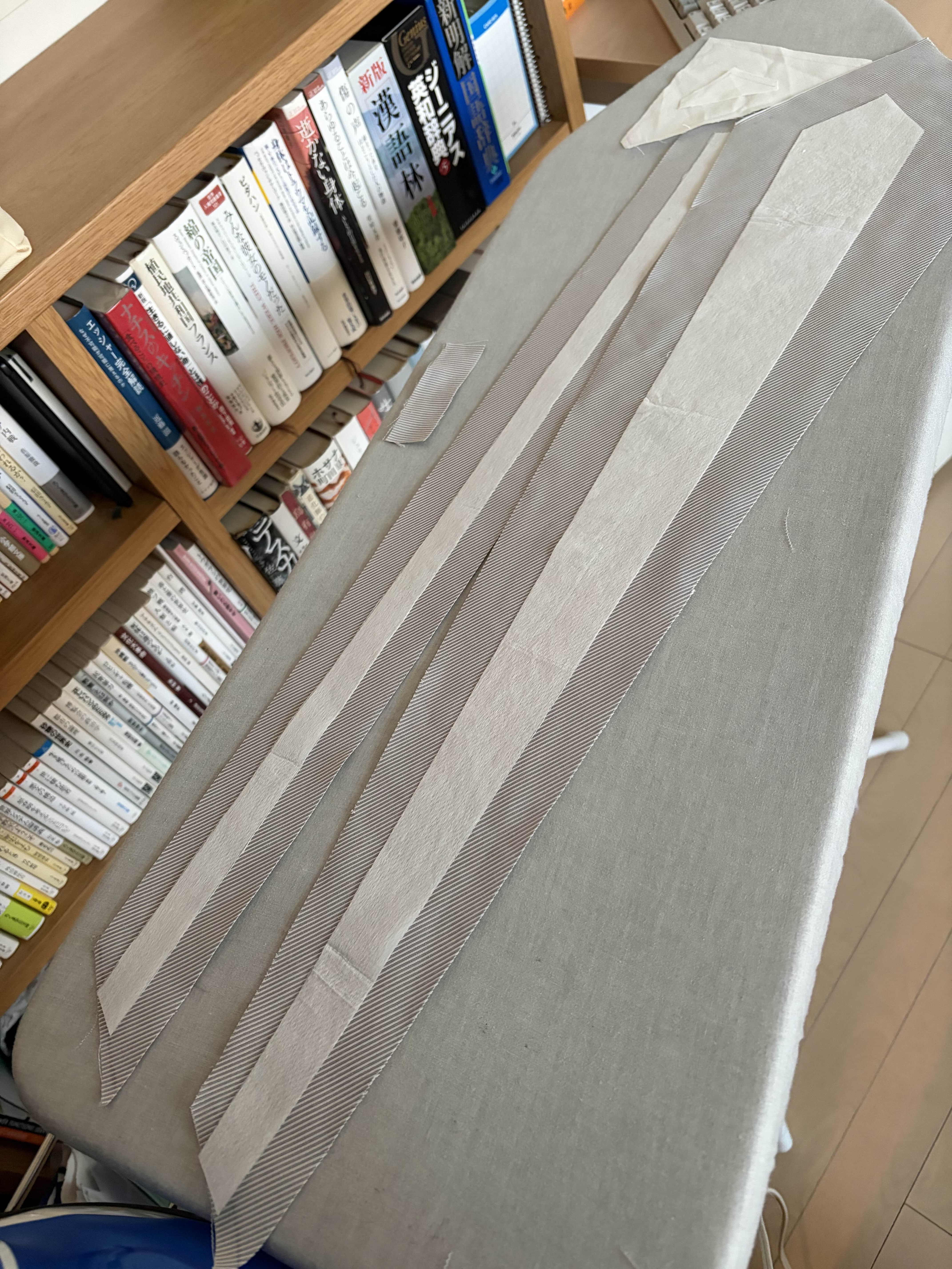 布地にアイロンをかける。ポリエステルの糸は高温にかけると溶ける。さらにバイアス裁ちしているので、より慎重にアイロン掛けしていく必要がある。生地が伸びやすいのだ。 アイロンをかけたあと、ネクタイの裏側に接着芯を貼った。補強するためである。ネクタイはピンと張っている形が美しい。その形を作るために接着芯を入れてみた。あとになって考えてみれば、この素材はかなり元々がしっかりしているし、接着芯を貼ったことにより苦労させられた部分もあった(これは必ず後述する)。そのため、ネクタイの形を美しく出したい、接着芯を貼るか迷っている、という場合は、中厚手のコットンを一枚噛ませればよいのではないかと思う。
